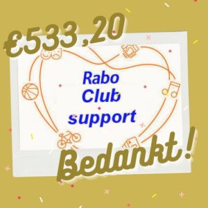 We bedanken iedereen die op onze deelnames hebben gestemd met de Rabo ClubSupport actie. Hiermee hebben we β¬533,20 mee opgehaald. Een prachtig bedrag waar we nog mooie concerten en projecten mee kunnen organiseren!